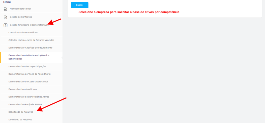 - Veja abaixo alguns prints de como chegar ao Gestão Financeira e Demonstrativos > Submenu: Solicitação de arquivos.