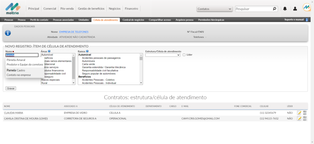 Pesquise a empresa que deseja agregar a atendente e clica no detalhe do registro 📄(papel branco) e acessar o menu cinza escuro “células de atendimento“.