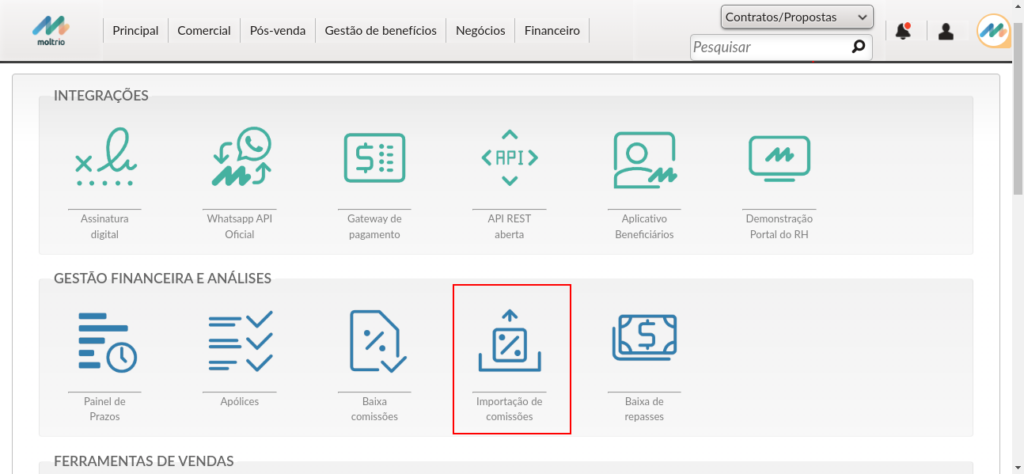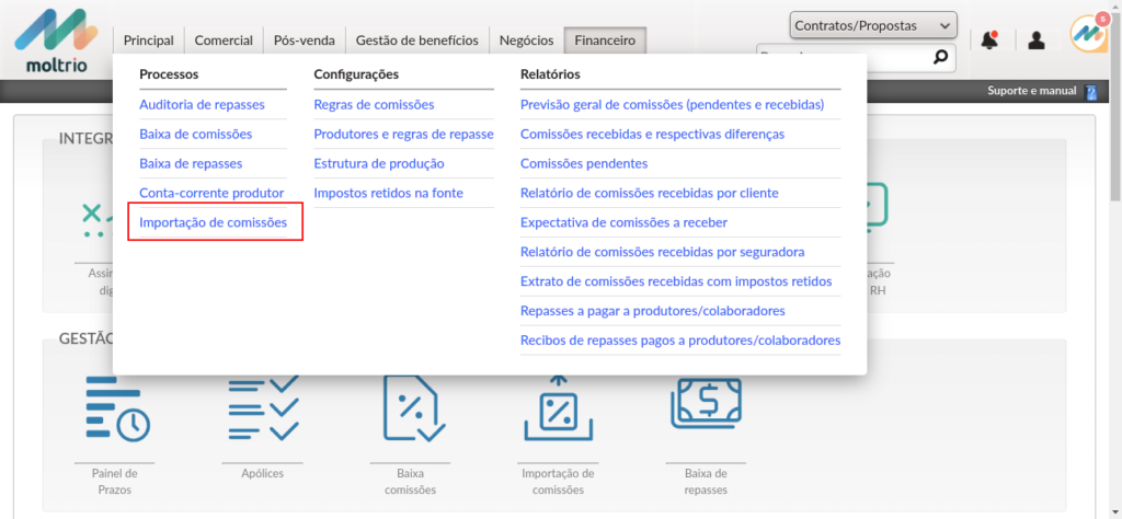 - O acesso à funcionalidade de importação das comissões pode ser efetuado pelo atalho na pagina principal ou através do menu: Financeiro > Processos > Importação de comissões