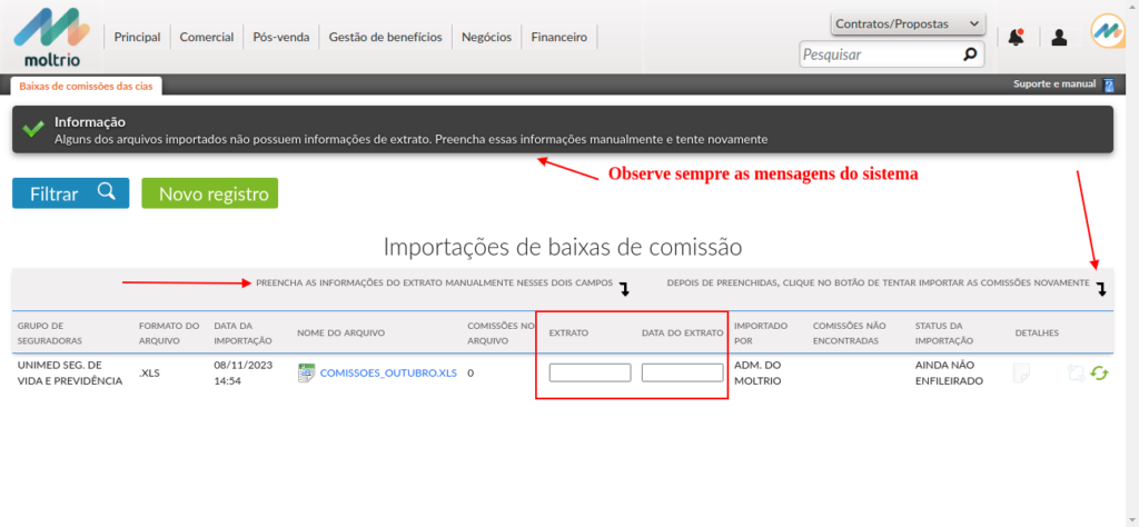 2.5 Observe sempre as mensagens do sistema. Se o extrato da seguradora ou operadora não tiver data de recebimento será nece