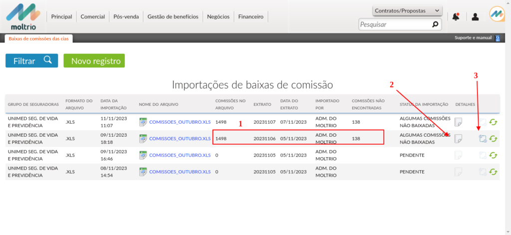 2.5. A importação das comissões possui uma sequência de fases e, enquanto estiver pendente, não iniciou o processo ainda. Caso sua importação esteja neste status, clique no link para reinicializar a leitura do arquivo.