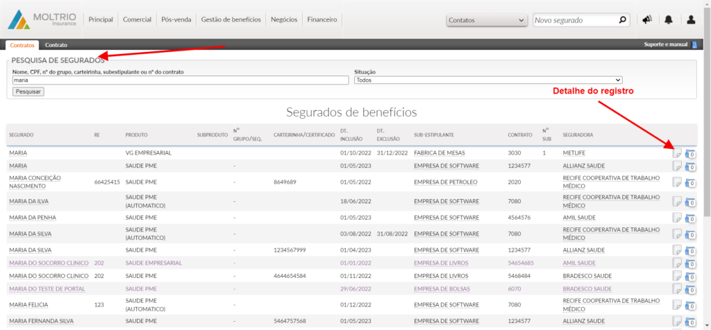 Pesquise o segurado que deseja reativar e clique no detalhe do registro.