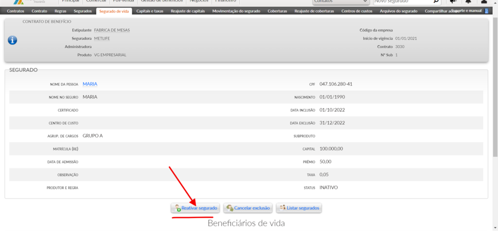 - Clique no botão “reativar segurado”.