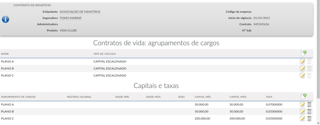 Antes de lançar as taxas e respectivos capitais mínimos e/ou máximos é necessário definir o grupo ou agrupamento de cargos que será atribuído a cada segurado para aplicação automática da taxa.